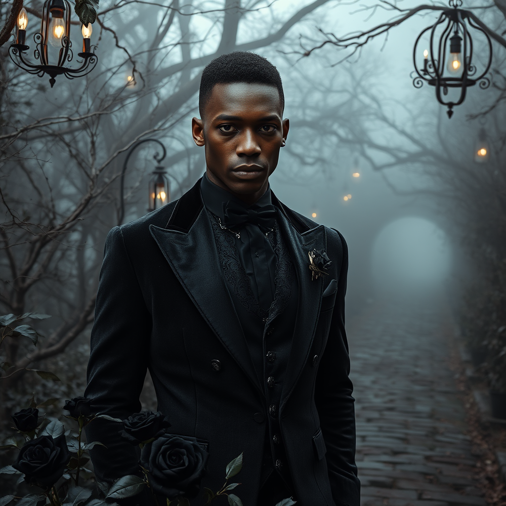 A striking Black man exudes elegance amidst a gothic paradise, dressed in an intricately tailored velvet suit adorned with subtle lace and silver accents. Dark, moody foliage encircles him, casting ethereal shadows across his refined features. His presence commands the hauntingly beautiful landscape, where vintage chandeliers hang from twisted branches and fog gently rolls over ancient cobblestone paths. Black roses bloom at his feet, as his eyes, intense and thoughtful, reflect the serene mystery of this enchanting setting.