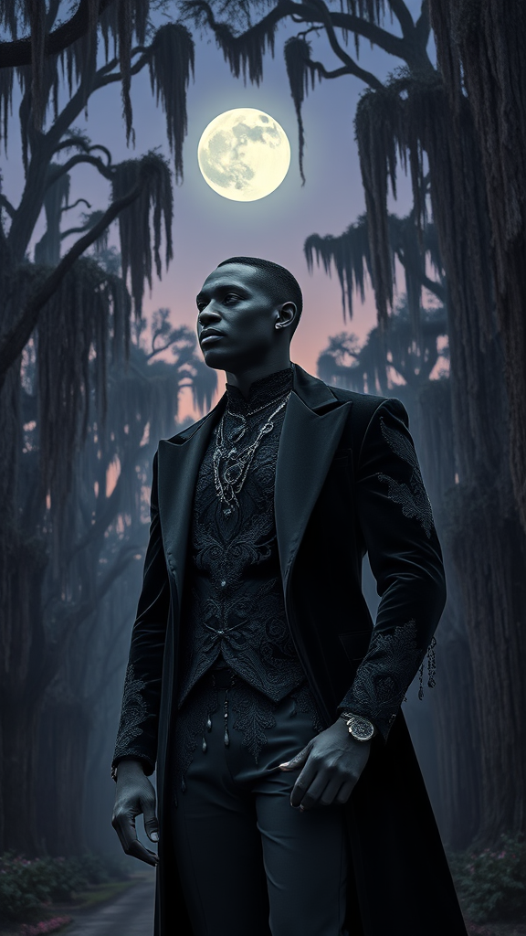 A striking black man stands elegantly amidst a gothic paradise, his silhouette framed by towering, ancient cypress trees draped with ethereal Spanish moss. His attire, a blend of opulent velvet and intricate lace, echoes the rich, dark hues of the twilight sky. Baroque jewelry glimmers in the moonlight, casting delicate shadows upon his strong features. The air is filled with the scent of blooming night-blooming flowers, and the distant sound of a raven's call adds an enigmatic allure to the scene. In this surreal landscape, he exudes an aura of regal sophistication and moody elegance, embodying the perfect fusion of gothic mystique and high fashion.