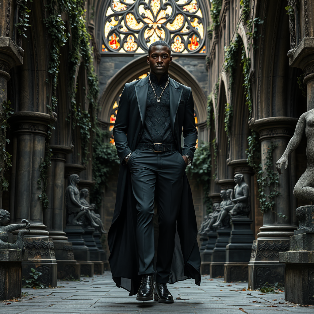 A striking black man stands elegantly in an ancient gothic paradise, embodying the fusion of modern fashion and timeless architecture; his garments are an artful mix of flowing dark fabrics and intricate lace, complemented by bold metallic accessories that catch the eerie light filtering through ornate stained glass windows, as he confidently navigates the labyrinth of ivy-covered archways and crumbling stone statues, exuding an aura of mystery and sophistication amidst the haunting beauty of his surroundings.