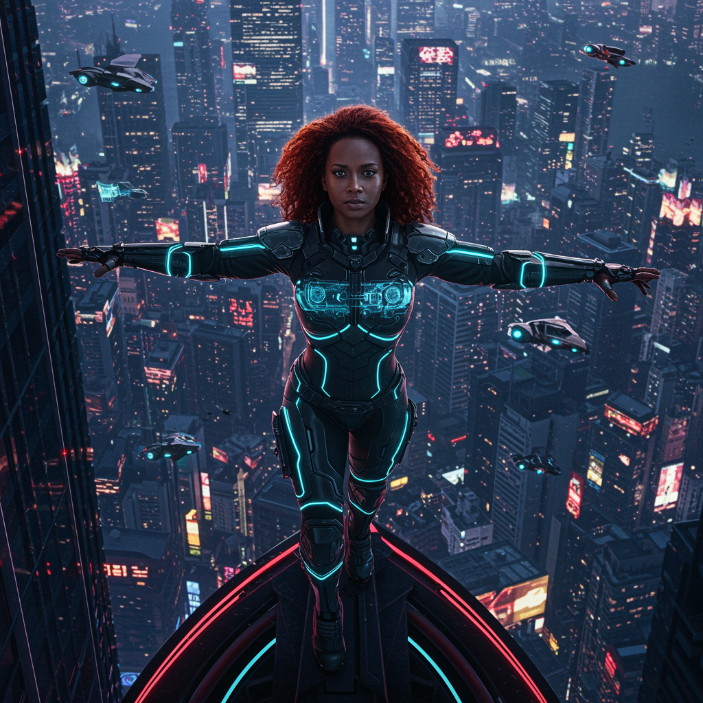 A striking black woman with vibrant ginger hair strikes a commanding and dynamic pose atop a soaring skyscraper, her arms gracefully extended. Clad in sleek, angular armor, neon lights pulse rhythmically along its edges, casting a futuristic glow. Neo-Tokyo's skyline, adorned with dazzling neon-lit skyscrapers, stretches into the horizon as flying cars zip by with fluid motion. As the camera zooms in, her face emerges, illuminated by a sophisticated holographic display projected from her helmet. Her advanced sensors meticulously scan the city below, searching for signs of danger or unrest. The scene is a mesmerizing blend of cyberpunk aesthetics reminiscent of Blade Runner, infused with the high-tech action of Starship Troopers and Dredd, merging with Pixar's imaginative world-building style. Directed by Ridley Scott and Ava DuVernay, this film promises a visually stunning adventure with a compelling and empowered black female protagonist at its heart. Photorealistic and hyperrealistic, the imagery is detailed, featuring matte skin, soft lighting, and heavy shadows, delivering an ultra-realistic masterpiece in 8k resolution.