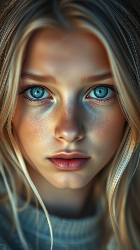 A striking blonde girl with captivating blue eyes, her gaze meeting the viewer's with confident allure, captured in a portrait style photograph. Her fair skin is detailed with a natural glow, exuding realism and photo-realistic quality. The image is in 8k resolution, meticulously capturing the intricate details of her features. She wears a subtle, minimalist piercing that adds an edge to her look. The scene is enveloped in diffused, soft lighting that adds warmth, and a shallow depth of field ensures she remains the focal point. The composition is sharp, showcasing expert hyperrealism, with cinematic lighting creating a dynamic and engaging atmosphere.
