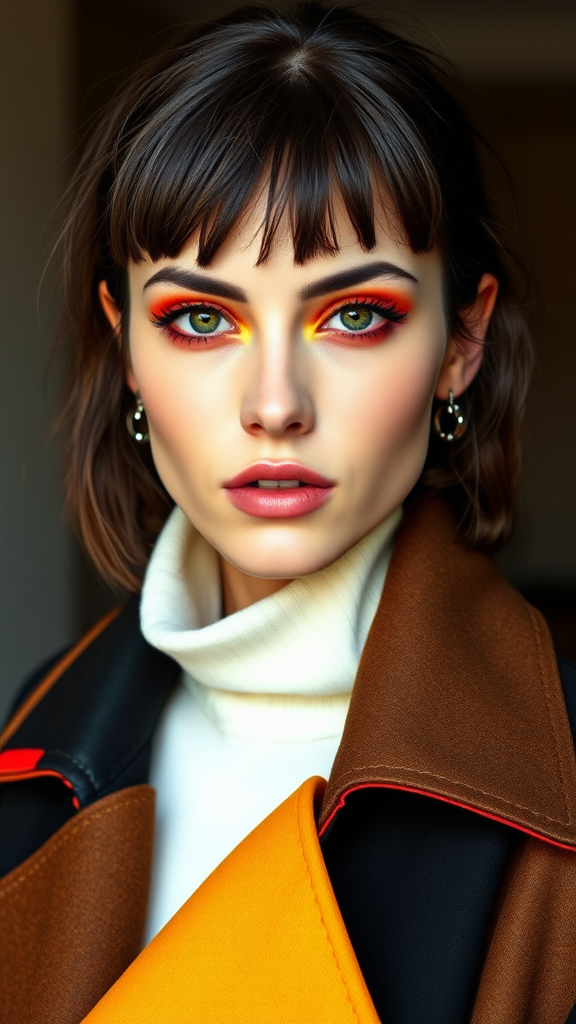 A striking brunette model with stylish bangs is featured, showcasing vibrant and artistic makeup reminiscent of an editorial fashion shoot for a leading beauty magazine. She is dressed in an oversized, abstract color block coat, exuding a sense of edgy sophistication and modern flair. The setting highlights her radiant complexion and the dynamic interplay of colors in both her makeup and clothing, creating a visually captivating ensemble.