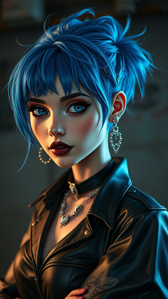 A striking character portrait featuring a woman with vibrant blue, artfully disheveled hair adorned with various piercings. She stands against a dark, industrial background, the rich contrast accentuating her piercing blue eyes. Her style is a blend of elegance and rock, seen in her black choker, glimmering earrings, and a leather shirt that subtly reveals a tattoo on her arm. The atmosphere is heightened by the cinematic light that casts an aesthetic, detailed glow across her facial features, highlighting her sharp focus and smooth complexion. Her lips are painted with dark makeup, complementing her edgy, yet sophisticated pose. The scene captures her detailed high-resolution features with realistic eye texture, set in a cartoon style, with a hint of brightness and intricate detail that draws the viewer in, embodied in an elegantly rebellious demeanor.
