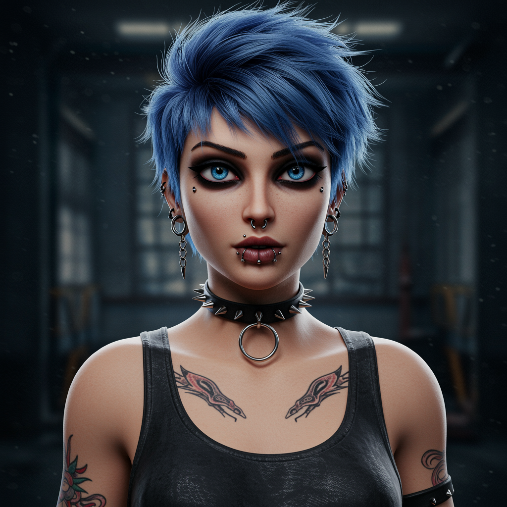 A striking character portrait of a woman with slightly chaotic blue hair, adorned with several piercings against a shadowy, dark background, inspired by the works of Charlie Bowater. Her image is captured in sharp focus with a smooth and aesthetically pleasing finish, rendered in high detail using octane technology. She is the sole focus, featuring a black choker and vibrant blue eyes. Her short hair is styled in a tousled manner, complemented by earrings and a tasteful assortment of jewelry. Her lips and nose are pierced, adding to her edgy appearance. The setting is a moody, dark industrial environment, enhanced with RTX lighting. The upper body view showcases her in dark rock-inspired attire, contrasting her elegant pose. Her arm displays a tasteful tattoo, and she wears a leather shirt that reveals her navel. Her face is adorned with dark makeup that highlights her piercing eyes, which are artfully rendered with realistic texture and brightness. The overall effect is cinematic, featuring intense, intricate detail, high-resolution sharpness, and a captivating, cartoonish yet realistic style.