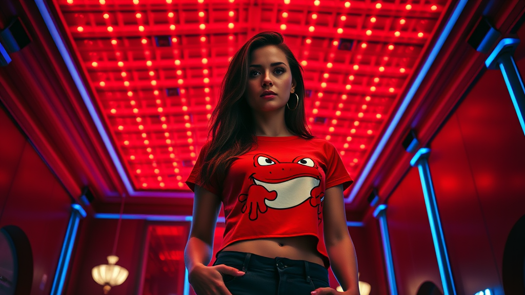 A striking, cinematic image of an alluring woman wearing a Frog-themed cropped t-shirt, standing confidently in front of the iconic Watergate building. The ceiling is adorned with an intricate grid of intense crimson lights, casting a dramatic red hue over the scene. Subtle blue accents trace the contours of the walls and support beams, amplifying the moody, nightlife atmosphere. Her stance exudes elegance and mystery, beautifully captured in a full-body shot that encapsulates the vibrant urban essence.
