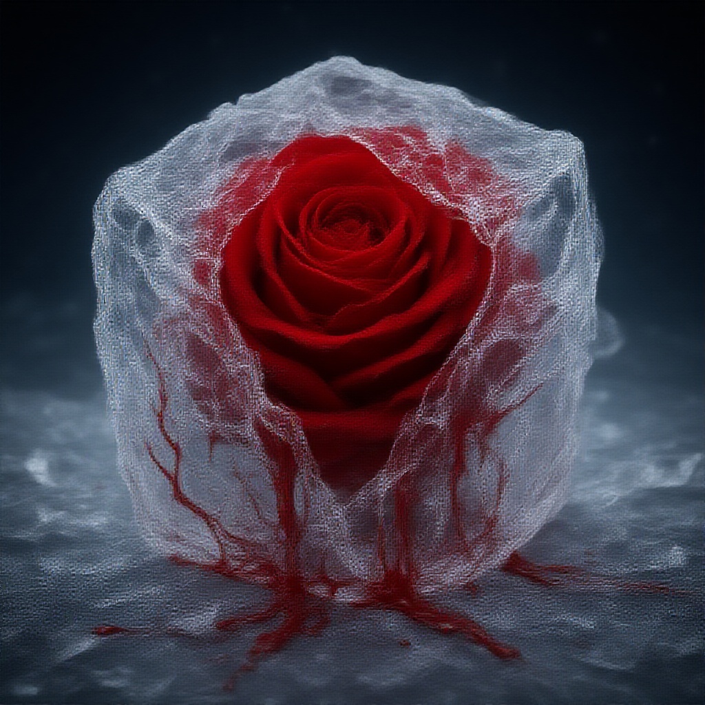 A striking close-up image depicting a stunning red rose piercing through a shattered cube of ice, surrounded by a web of intricate cracks on the icy surface. The frosty hues add a delicate touch as droplets of blood trail from the vibrant petals, blending with the melting ice. Evoking Valentine's Day emotions, the scene is set with cinematic precision, offering dramatic lighting and sharp focus for a visually captivating experience.