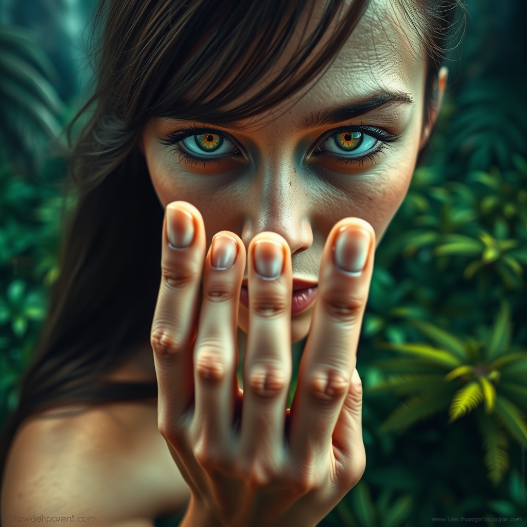A striking close-up image of a woman poised above a lush rainforest, her vibrant eyes radiating an otherworldly allure. The scene captures intricate details with an emphasis on the enchanting atmosphere, though it subtly incorporates imperfections like slightly blurred textures and hint of low-resolution qualities. Her hands, while artistically rendered, reflect an abstract form, adding a unique artistic expression with slightly distorted anatomy and an imaginative number of fingers. The background subtly reveals elements like text and watermark artifacts, enhancing the sense of a dreamlike, surreal composition, while maintaining a balance between clarity and a touch of mysterious distortion.