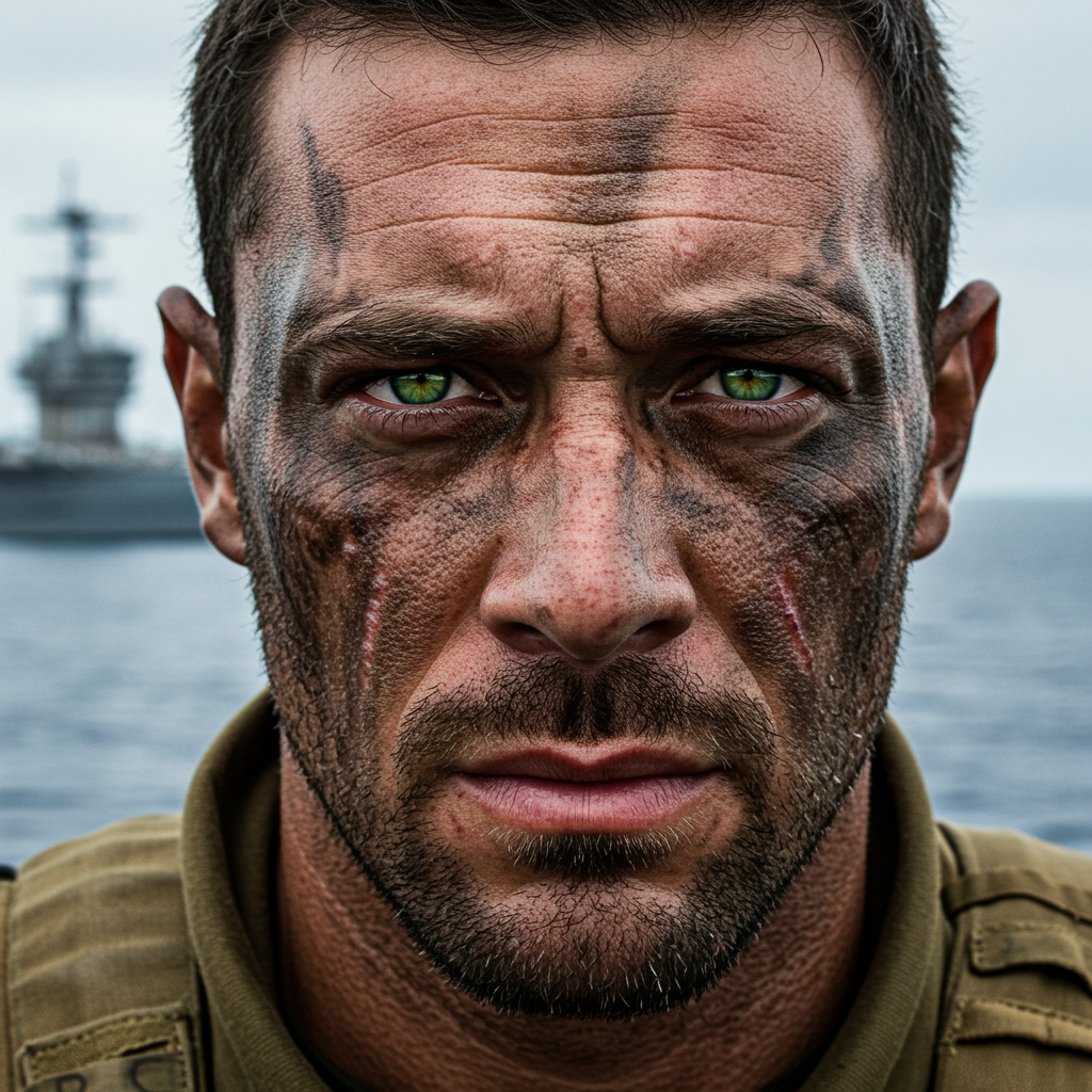 A striking close-up of a rugged navy seal with intense green eyes and a weathered face marked by faint scars, his face partially covered in tactical paint. He wears a distinguished navy seal uniform, exuding strength and resolve. In the blurred background, the silhouette of an aircraft carrier hints at his domain. Captured with a 50mm lens and natural lighting at F1.2, the photograph highlights the depth and resilience in his eyes, adding a layer of intrigue and storytelling to his formidable presence.