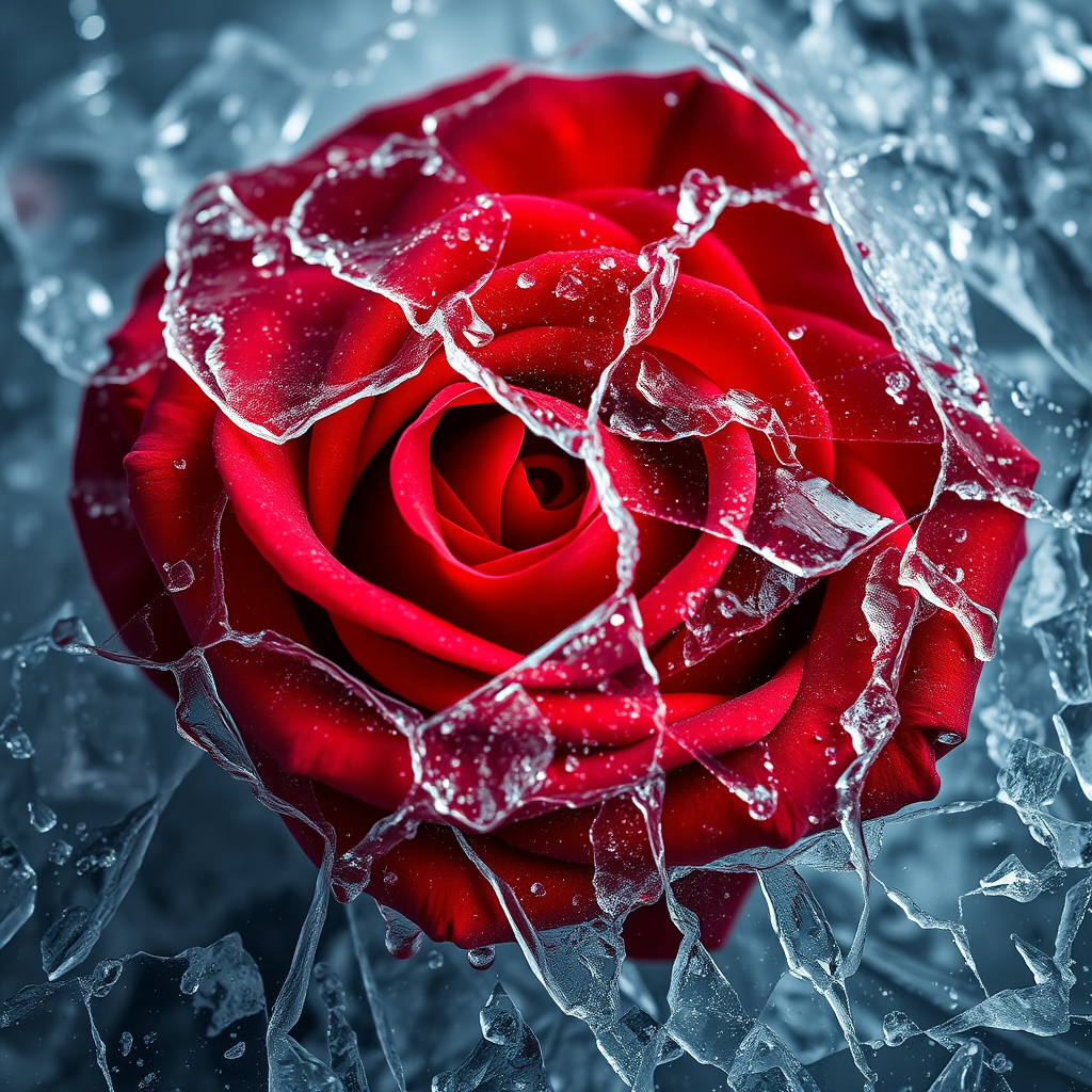 A striking close-up of a stunning crimson rose emerging through a shard-covered block of ice, its petals fiercely vivid against the fractured, glistening ice surface. The frosty hues accentuate the delicate blood-red droplets cascading from the rose, mingling with the melting, translucent ice. Exuding a romantic and intense Valentine’s Day atmosphere, the image captures intricate details with dramatic, cinematic lighting, creating an arresting contrast between the vibrant flower and the frosty, splintered backdrop.