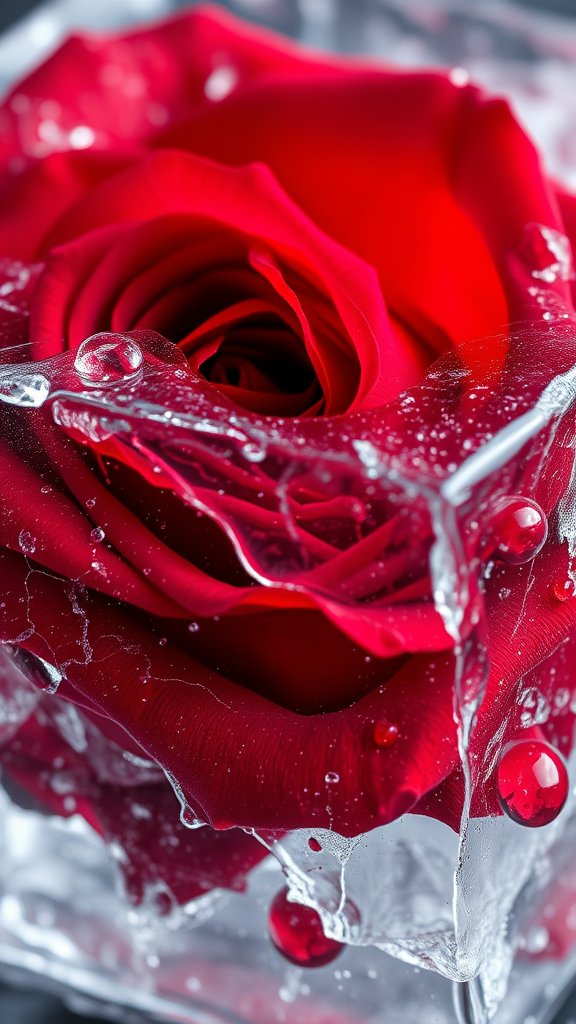 A striking close-up of a vibrant red rose piercing through a transparent ice cube, surrounded by a delicate network of splintered cracks; the ice glistens in frosted hues. Crimson droplets gently cascade from the rose petals onto the melting ice, creating a dramatic interplay of warmth and cold. The scene exudes a romantic, Valentine’s Day ambiance, captured in cinematic detail with intricate textures and dramatic lighting.