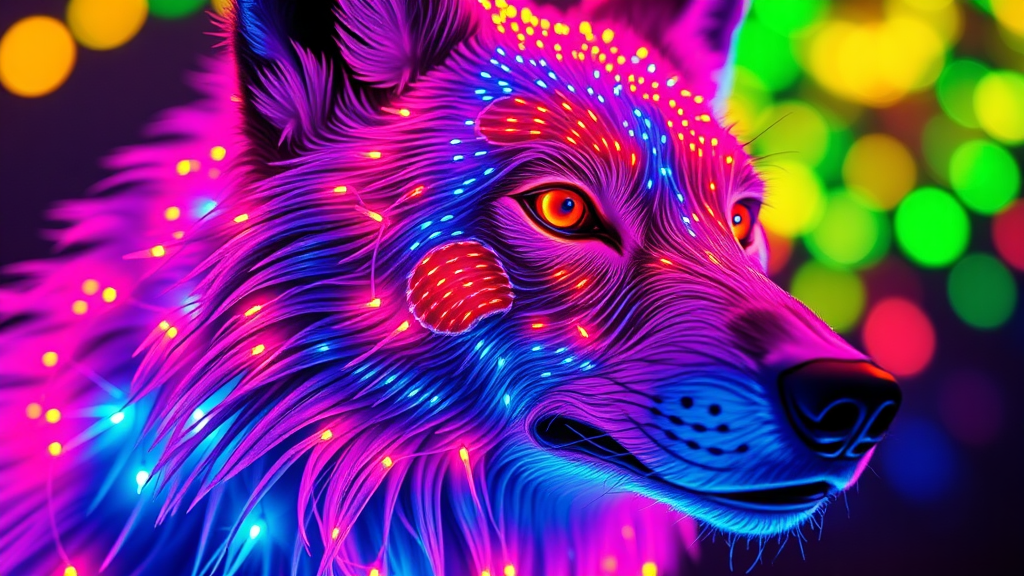A striking close-up of a wolf crafted from vibrant neon hues, intricately detailed and bathed in an ethereal glow, capturing the mesmerizing allure of fairy lights. The composition showcases bright, dynamic colors, enhanced by volumetric shafts of light and captured in vivid HDR, set against a stark 9:16 aspect ratio backdrop.