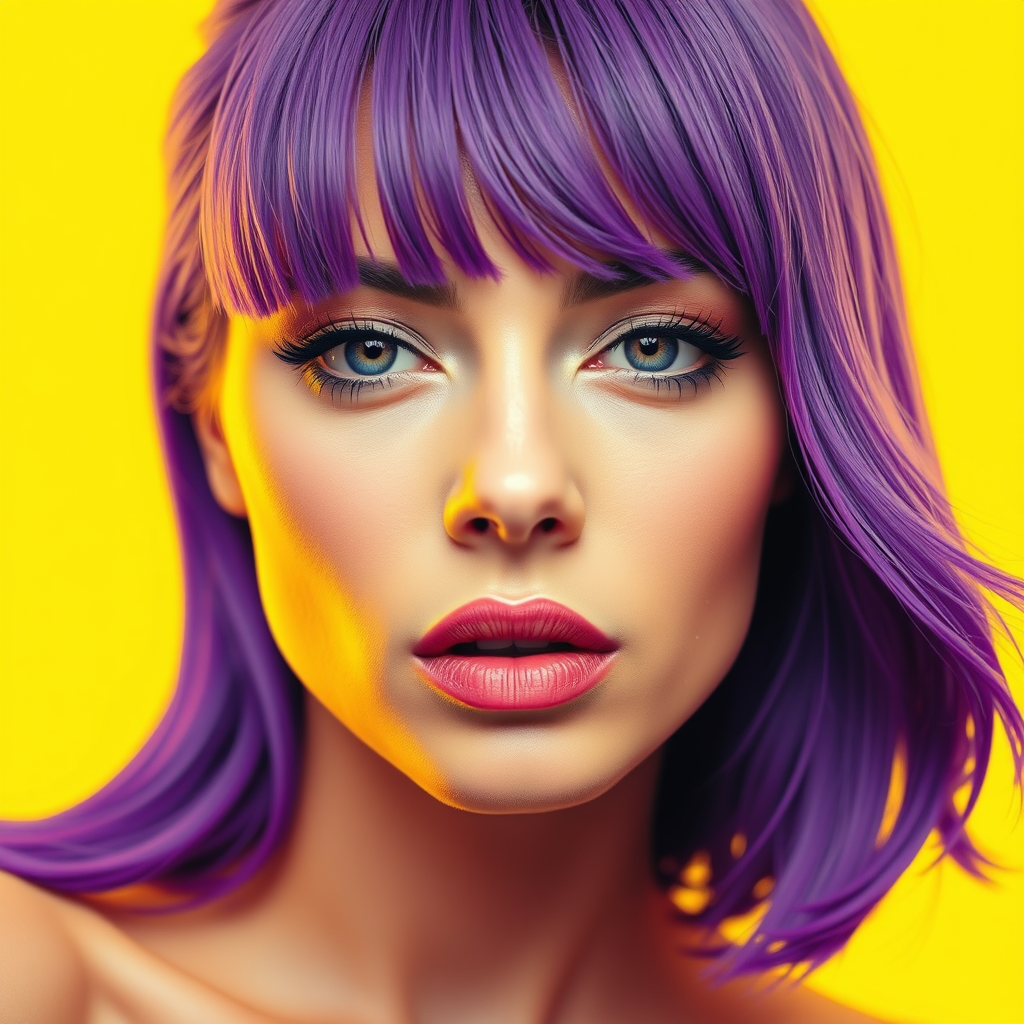 A striking close-up of a woman with vivid purple hair, blending the vibrant, bold colors and graphic lines of pop art with the high-contrast, minimalist essence of classic portrait photography. Her face is sharply detailed, featuring a captivating gaze that draws the viewer in. Set against a bright, contrasting background, this image encapsulates both iconic and contemporary aspects of modern pop culture, echoing the stylistic influences of Andy Warhol and Richard Avedon.