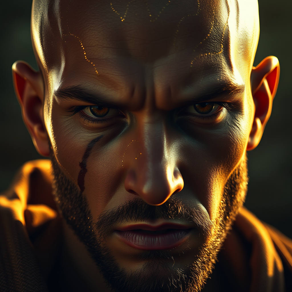 A striking close-up portrait of a bald warrior, inspired by the style of Ben Templesmith, showcasing intricate glittering gold veins across his skin. Captured in high resolution with a focus on realism, the photograph exudes a sense of intensity and strength. The warrior's gaze is piercing, highlighted by dynamic backlighting that casts a cinematic glow around him, enhancing his formidable presence. Subtle creative elements, like a faint scar on his cheek and a hint of war paint beneath his eyes, add depth and character while maintaining the core concept.