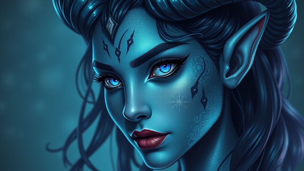 A striking close-up portrait of a female tiefling with intricate, lush horns curving elegantly from her head. Her skin is a shimmering, ethereal blue, reminiscent of the night sky, adorned with celestial patterns that suggest her cosmic nature. Her eyes glow with an otherworldly light, combining an alluring mix of mystery and intensity. Her features are both demonic and alluring, with a blend of beauty and danger. The character design captures the essence of a demon anime girl, with influence from the magical realism style of Arcane. This demon girl radiates a powerful presence, with traces of mysticism and fantasy that evoke the vibrant, imaginative world of Dungeons & Dragons. The oni-like horns add to her captivating and formidable appearance, making her a unique blend of enchanting allure and supernatural strength.