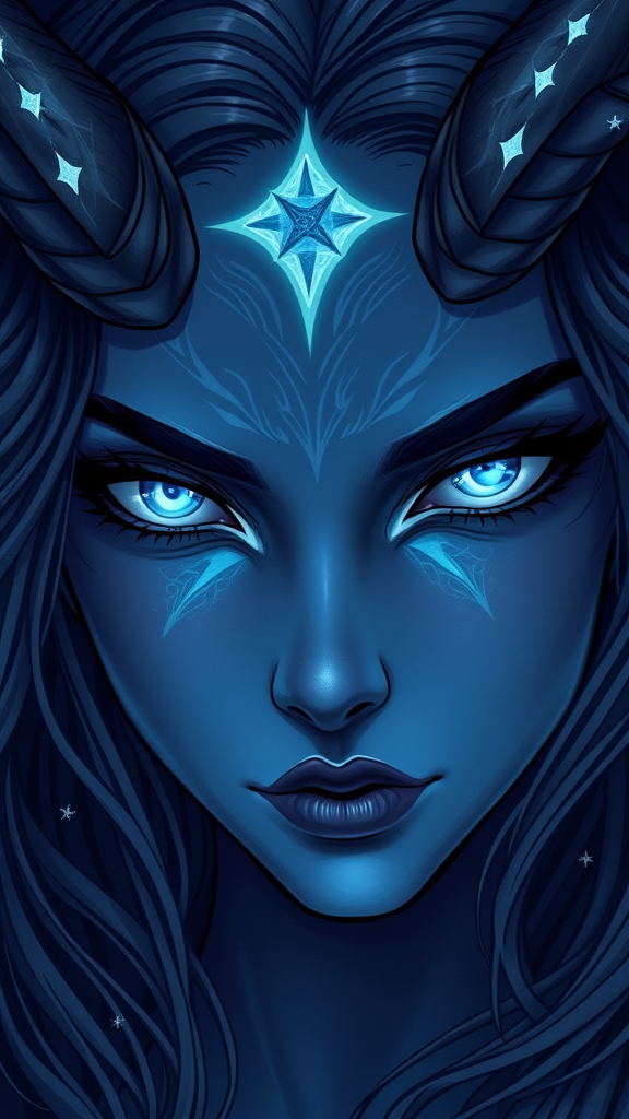 A striking close-up portrait of a female tiefling with an ethereal, cosmic aura. Her skin is a mesmerizing shade of deep azure, reminiscent of the night sky. Her eyes glow with an otherworldly light, casting a soft luminescence that contrasts with the deep shadows on her face. Two majestic, lush horns arch gracefully from her forehead, reminiscent of ancient oni, their tips barely brushing the edges of the frame. Her expression is fierce yet hauntingly beautiful, capturing the essence of a demon girl in an anime style. Her hair flows like liquid stardust around her, complementing the intricate patterns and markings that adorn her celestial visage, akin to a character from an arcane painting. This depiction exquisitely balances the mystical allure and formidable presence of a D&D-inspired tiefling.