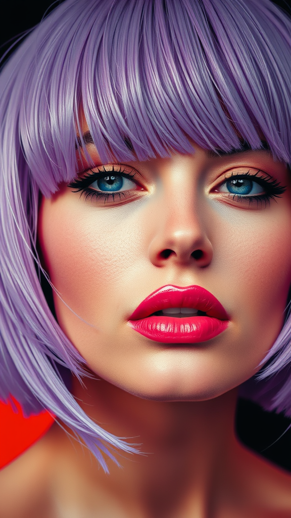 A striking close-up portrait of a woman featuring vivid lavender hair, merging the iconic styles of Andy Warhol and Richard Avedon. The portrait showcases pop art's dynamic colors and distinct graphic lines, coupled with the high-contrast elegance of minimalist photography. Her face is sharply defined, highlighted by a captivating gaze, set against a bold, contrasting background, brilliantly capturing the essence of modern pop culture's iconic allure.