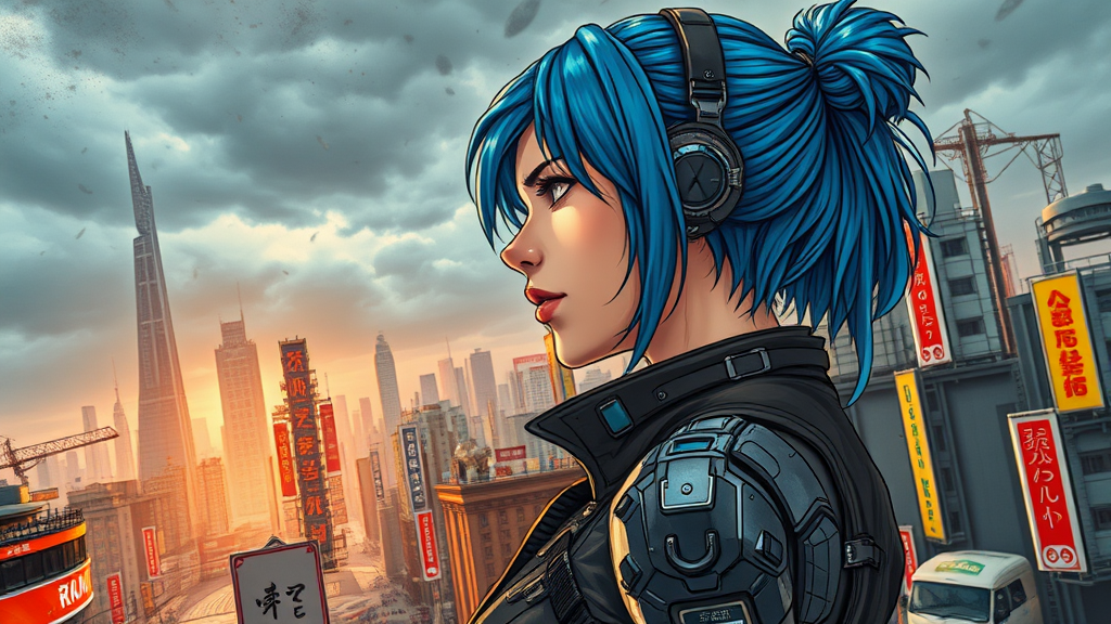 A striking depiction of a formidable woman with cybernetic enhancements and vibrant blue hair, showcased in side profile, adorned in avant-garde attire amidst the bustling landscape of a dystopian Japanese metropolis. The scene is intricately detailed, set against a brooding, overcast sky. The composition is rich with complex linework, infused with manga essence, cell-shaded nuances, and reminiscent of comic book artistry. This digital painting, a colorful illustration, is inspired by the styles of Masamune Shirow and Hajime Shimomura, capturing a fusion of dynamic storytelling and futuristic aesthetics in a graphic novel format.