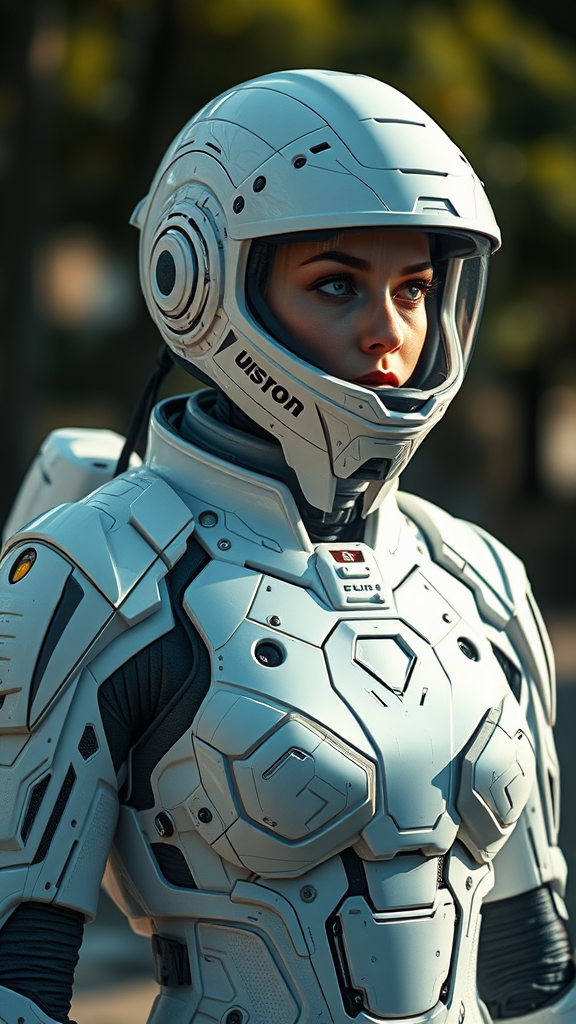 A striking depiction of an advanced white sci-fi female armor, intricately designed with a cybernetic helmet, enveloped in a full, insulated suit resembling a spacesuit. The character is bald, emphasizing the sleek, futuristic aesthetic. The armor showcases an abundance of fine details, embodying the high-tech allure of a sci-fi movie style. Captured in an outdoor setting, the scene is illuminated by natural light, achieving photorealism with a cinematic rendering brought to life by ray tracing. The photograph exudes an air of high quality and detail, presented in a third-person perspective. A subtle blur effect and long exposure enhance the 8K Ultra-HD image, while the lighting, both moody and cinematic, adds depth and intensity to the visual narrative, maintaining the widescreen aspect ratio of 9:16.
