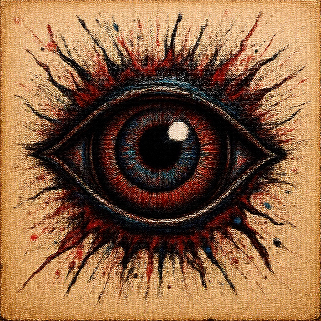 A striking depiction of an eye drenched in a cascade of vibrant paint and splatters upon aged brown paper, rendered in the vivid style of noir comic art with gothic black and white contrasts. This scene blends the raw intensity of angura kei with the grandeur of monumental ink paintings, articulated through chiaroscuro portraiture techniques. The composition exhibits biomorphic forms merged with the tactile depth of oil painting, resulting in an evocative and dynamic visual narrative.