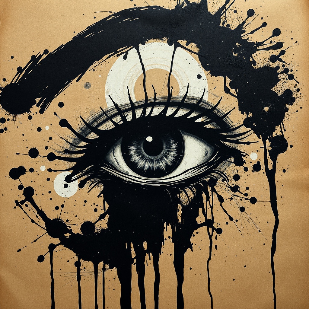 A striking depiction of an eye drenched in splashes of paint and stains on textured brown paper, capturing the essence of noir comic art with a touch of gothic black and white. The composition blends angura kei influences with the grandeur of monumental ink paintings. Emphasizing chiaroscuro portraitures, the image resonates with biomorphic forms, reminiscent of an oil painter’s touch, crafting a mysterious and evocative representation.