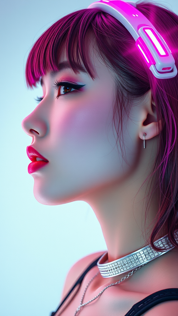 A striking depiction of cyberpunk aesthetic featuring a girl's side profile, enhanced by graphic design elements; her face exudes a blend of prettiness and cuteness, framed by a lush pink electronic aura. Her gleaming lips accentuate her white skin, and she wears a silver shiny necklace. The silver background amplifies the futuristic mood, capturing an essence of vibrant, high-tech allure.