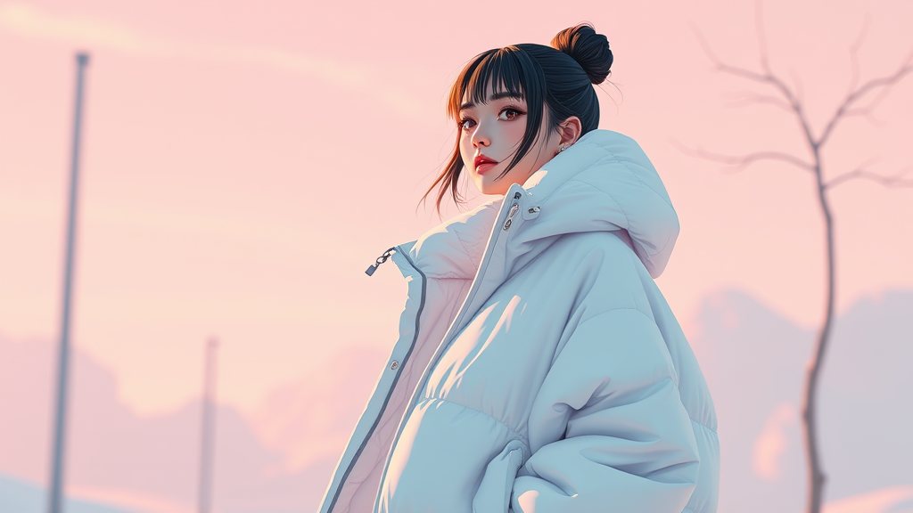 A striking digital illustration of a woman donning an oversized poncho puffer jacket, reminiscent of OffWhite's iconic style, with influences from the nostalgic lofi girl internet meme and Tumblr aesthetics. The scene captures the essence of Yanjun Cheng's artistic flair, with elements trending on Dezeen, and presents a fusion of Beeple's 3D rendering techniques with the captivating cartoon styles of Rhads and Lois van Baarle. Set in bright pastel colors, this retro anime-inspired artwork radiates a whimsical blend of modern and vintage charm, depicting a serene anime girl in a dreamy, easygoing atmosphere.