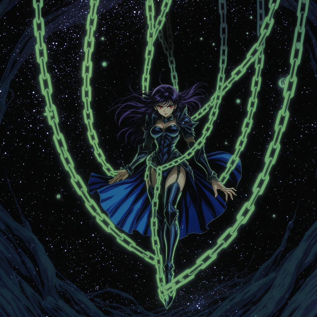 A striking DVD screenshot from a 90s dark fantasy anime OVA reveals a captivating girl with an elegant, well-defined silhouette, clad in intricately detailed dark armor and supple leathers reminiscent of a formidable knight. She is ensnared by vivid, acid green chains glowing with an unearthly luminescence that extend ominously from the edges of the frame. Suspended in the heart of a vast, apocalyptic black cosmos, her expression is a mix of defiance and vulnerability, while around her, the cosmic void is alive with the spectral presence of gleaming eyes, each pair resonating with enigmatic intelligence and ancient mysteries. The artwork captures the iconic grainy texture and atmospheric style of 90s anime series like Cowboy Bebop, Evangelion, and Berserk, evoking a haunting yet captivating scene that blends dystopian surrealism with mystic fantasy elements.