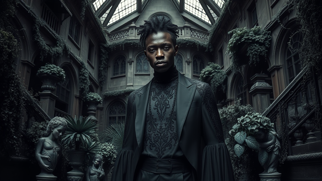 A striking editorial featuring a black man in a gothic paradise, dressed in avant-garde fashion with dark, flowing fabrics and intricate lace detailing, surrounded by hauntingly beautiful architecture and lush, shadowy gardens that create an ethereal yet mysterious atmosphere.