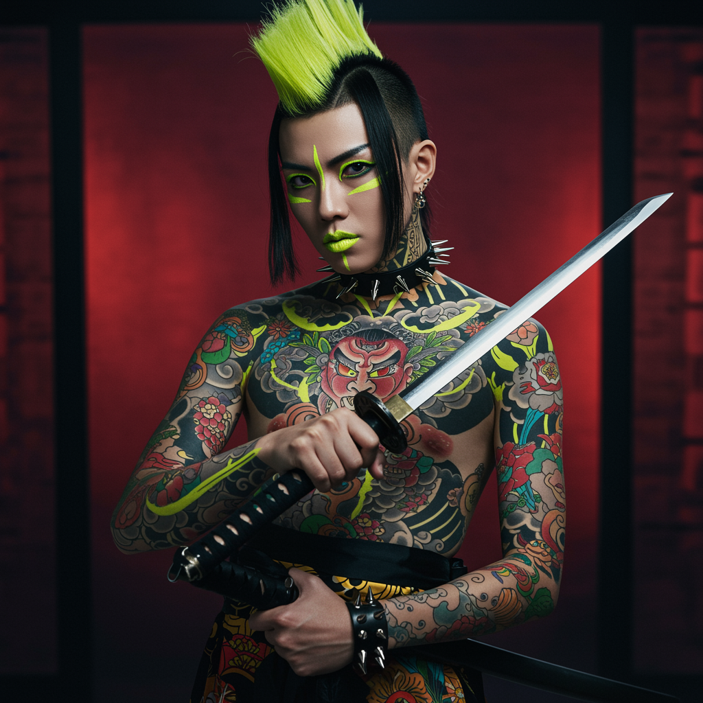 A striking editorial Vivienne Tam-inspired portrait captures a gothic punk rebel from Japan, adorned with vivid neon yellow and black tattoos that twist and turn across their skin. The rebellious figure wields a gleaming katana with a confident grip. The artwork is rendered in a sophisticated anime style, employing expressive textural techniques that bring the character to life with photo-realistic details. A vibrant, colorful palette energizes the scene, while elements of hurufiyya add an abstract elegance. The portrait is rendered in 32k UHD, showcasing fluid dynamic brushwork and hyper-detailed realistic features. Sharp angles and hard-edged painting techniques are reminiscent of ukiyo-e prints. The overall effect is a breathtakingly beautiful fusion of classic and contemporary art styles, encapsulating the essence of Japanese avant-garde fashion.