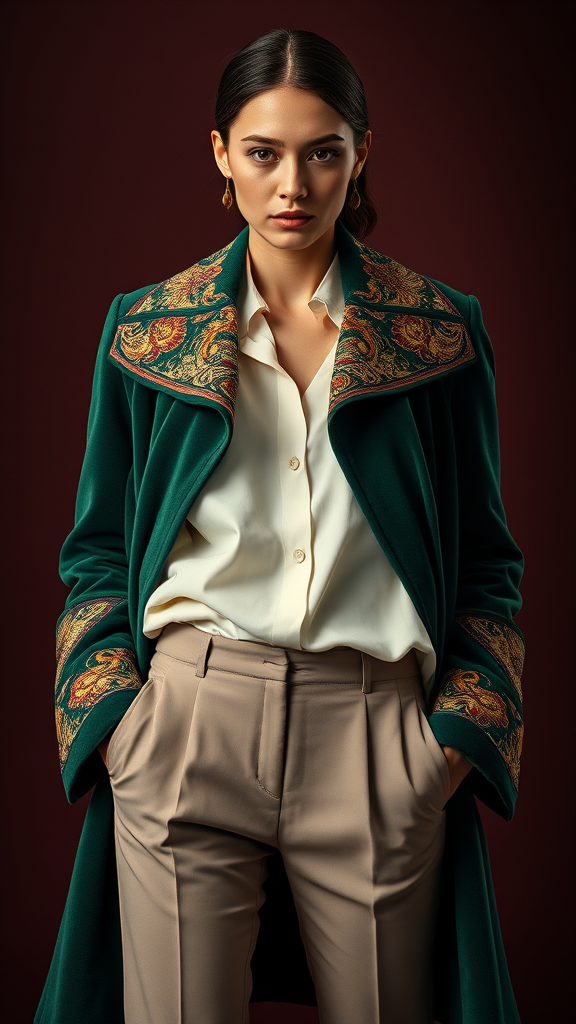 A striking fashion cover features a woman model from the front view, showcasing her upper body against a deep mahogany backdrop. She wears a luxurious emerald green velvet coat adorned with intricate Persian carpet motifs around the cuffs and collar, elevating her elegant ensemble. Underneath, she dons a crisp ivory blouse, while soft taupe trousers add a subtle contrast, completing her sophisticated and artistic look. Her expression is poised, exuding confidence and style.