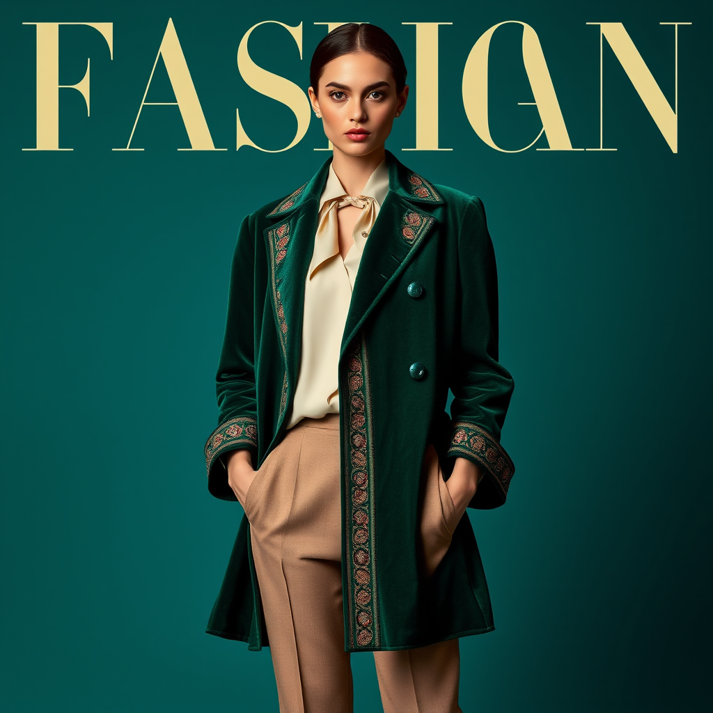 A striking fashion cover featuring a front view of a woman model against a rich teal background, wearing an emerald green velvet coat intricately designed with Persian mosaic patterns around the cuffs and collar, paired with a soft ivory blouse and tailored taupe trousers.