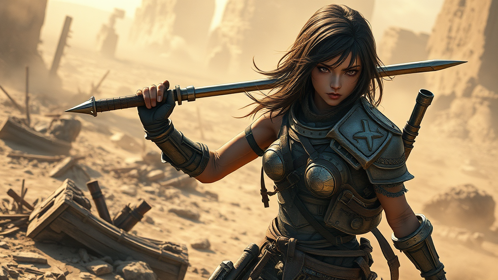 A striking female bandit navigates a post-apocalyptic wasteland. Her full body is captured in a key visual that showcases breathtaking beauty and intricate details. The cinematic image features a dynamic pose, captured in the best quality and ultra-sharp focus reminiscent of Takeshi Obata’s style. She wields a weapon, embodying strength and grace. Her armor, scavenged and pieced together from remnants of the old world, tells a story of survival and resilience. The environment around her is desolate yet formidable, with remnants of a forgotten civilization peeking through the dust. Her expression is fierce, eyes sharp and focused, as she stands as a beacon of hope and determination in a world tainted by chaos.