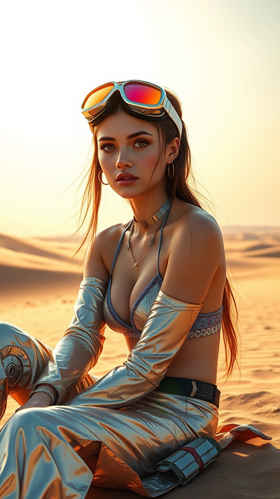 A striking female character with goggles perched on her forehead sits in a vast desert landscape, embodying the essence of cyberpunk with a hyper-detailed and realistic portrait style. Her presence exudes womancore energy, accentuated by metallic elements woven into her attire and accessories, reflecting the sun's rays. The scene blends elements of outrun with neon pops of color, giving her form a vibrant, hyper-realistic pop feel. Subtle angelcore influences are evident in delicate, ethereal details that juxtapose the harshness of the desert. The overall vibe is a fusion of futuristic and serene, capturing a moment of introspective calm against a backdrop of endless dunes.