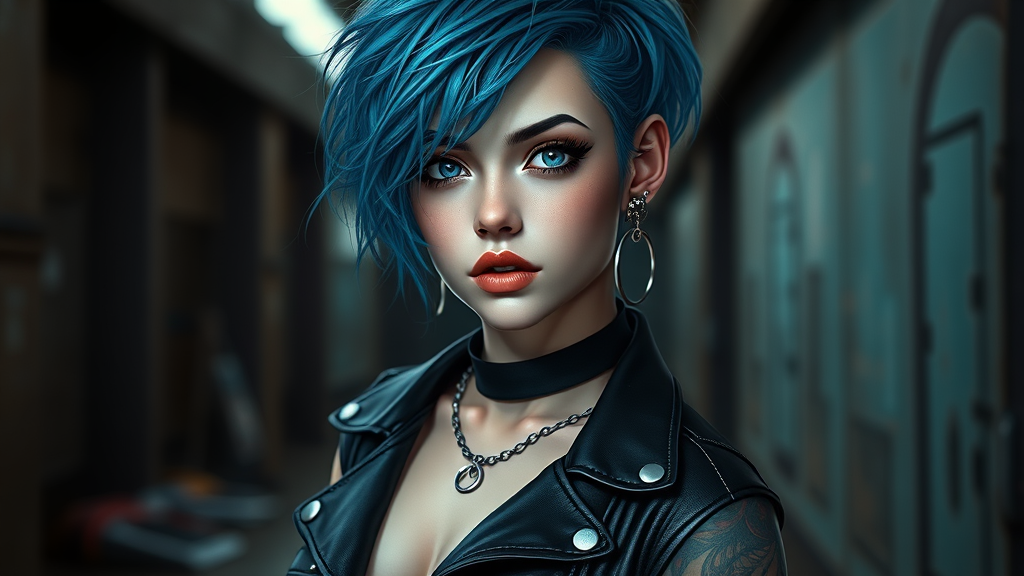 A striking female character with tousled cerulean hair and multiple piercings, set against a moody, near-black industrial backdrop, inspired by Charlie Bowater. Her portrait captures a sharp focus, blending smooth, aesthetic details with an extremely intricate octane-render style. This depiction highlights a sole figure adorned in a black choker and edgy rock-inspired attire, showcasing her vibrant blue eyes amid slightly blurry surroundings. Her short hair complements her earrings and other jewelry, accentuating her lips and nose piercing. She's elegantly posed, with dark makeup enhancing her allure, and a tattoo subtly visible on her arm. The leather shirt slightly reveals her navel, reflecting light with a beautiful detailed glow. Cinematic lighting accentuates her features, with realistic eye textures and bright, captivating eyes, all rendered with high detail in a captivating cartoon style. Her presence is both detailed and dynamic, merging realistic textures with a stylized, high-resolution finish.