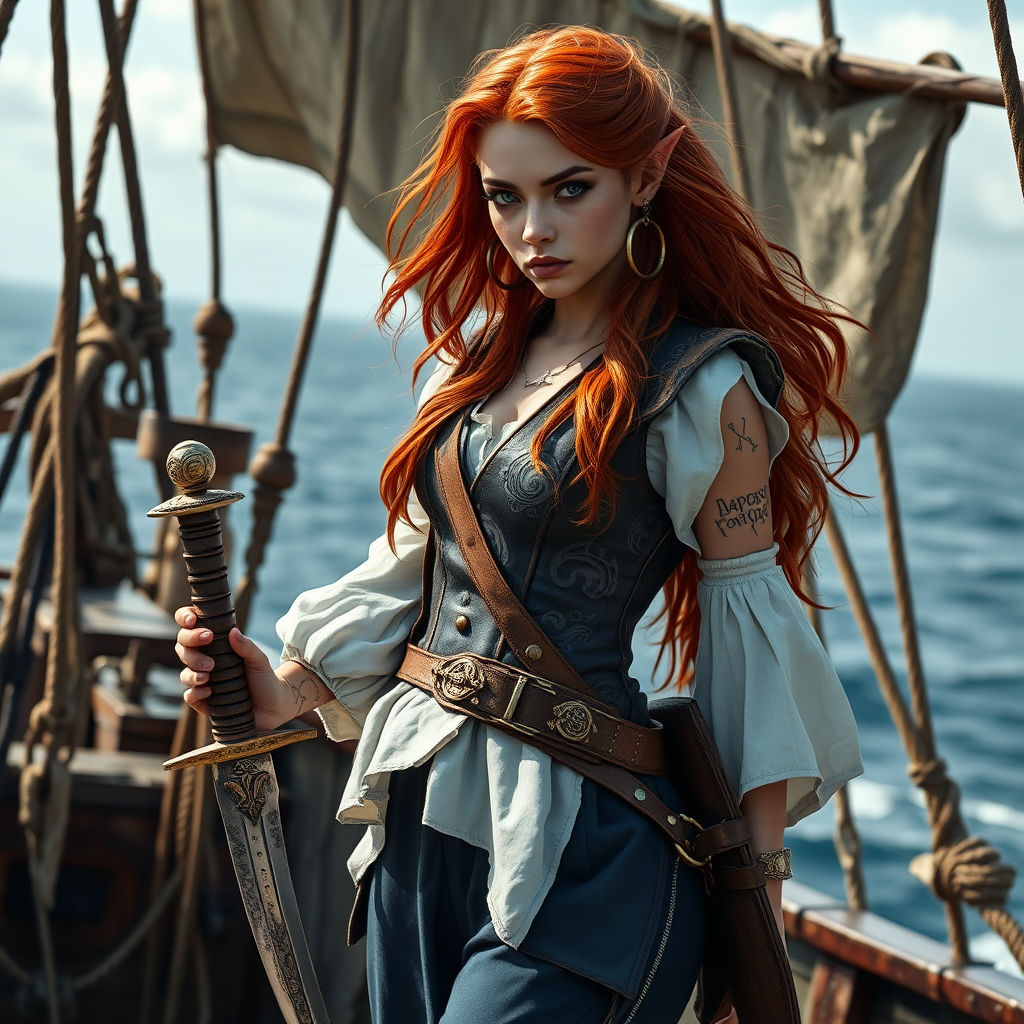 A striking female elf pirate stands poised on the deck of a weathered ship, her piercing emerald eyes scanning the horizon with an intense gaze, sun-kissed auburn hair cascading over her shoulders like a waterfall of fiery silk. Her elegantly pointed ears peek through the strands, adorned with gold hoop earrings that sway gently with the ocean breeze. Clad in a fitted leather vest, encrusted with intricate patterns of swirling waves and mystical symbols, it complements her billowing white blouse, the sleeves cinched tightly with crimson ribbons. Her trousers, fashioned from deep navy fabric, tuck neatly into well-worn boots that whisper tales of countless adventures. At her side, a curved cutlass hangs confidently, its hilt fashioned from the bones of a sea creature, glinting with embedded sapphires. Her skin, a fair alabaster kissed by the sun, contrasts with a series of delicate tattoos mapping out constellations across her forearms. Behind her, the ship's sails billow in an unseen wind, tattered and marked by the trials of the sea, each tear a testament to her fearless voyages. Her presence, both commanding and ethereal, captures the dual essence of grace and audacity as she navigates her realms with timeless elegance and unyielding resolve.