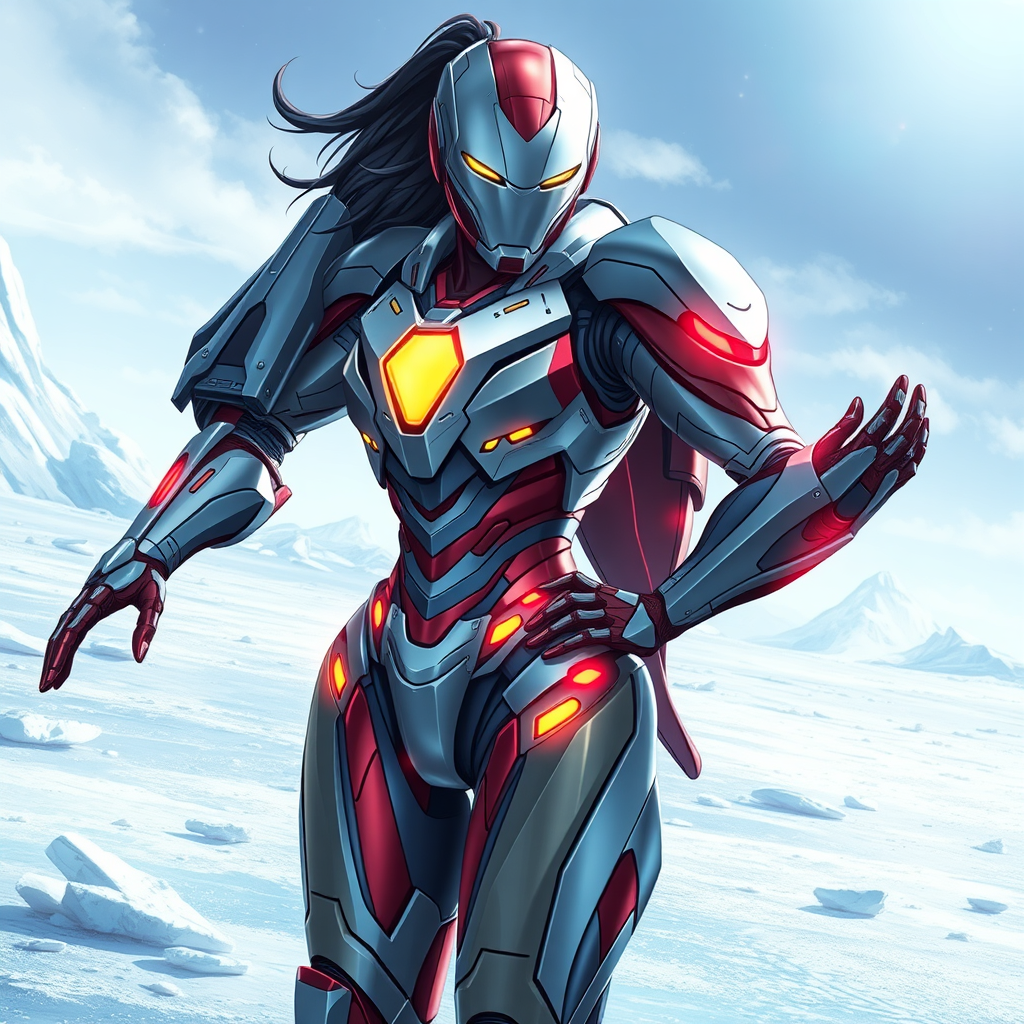 A striking female hero donning a futuristic Iron Maiden suit stands heroically in a tranquil, icy expanse reminiscent of Chill Penguin's stage. Her armor features a curvaceous design with sleek metallic elements and advanced repulsor technology intricately integrated into her X suit, showcasing a seamless fusion of organic and mechanical aesthetics. Rendered with ultra-fine detail and masterful lighting, the vibrant, bold colors of her suit mirror Iron Man's iconic design, blending Tony Stark's modern elegance with the grace of an anime-inspired heroine. The breathtaking UHD quality captures her powerful silhouette in a full-body pose, emphasizing her strength and allure. The artwork effortlessly merges anime and comic book styles, drawing inspiration from renowned artists like Adi Granov and Takeshi Obata. The serene icy backdrop contrasts beautifully with the dynamic presence of the heroine, adding depth and drama to the scene.