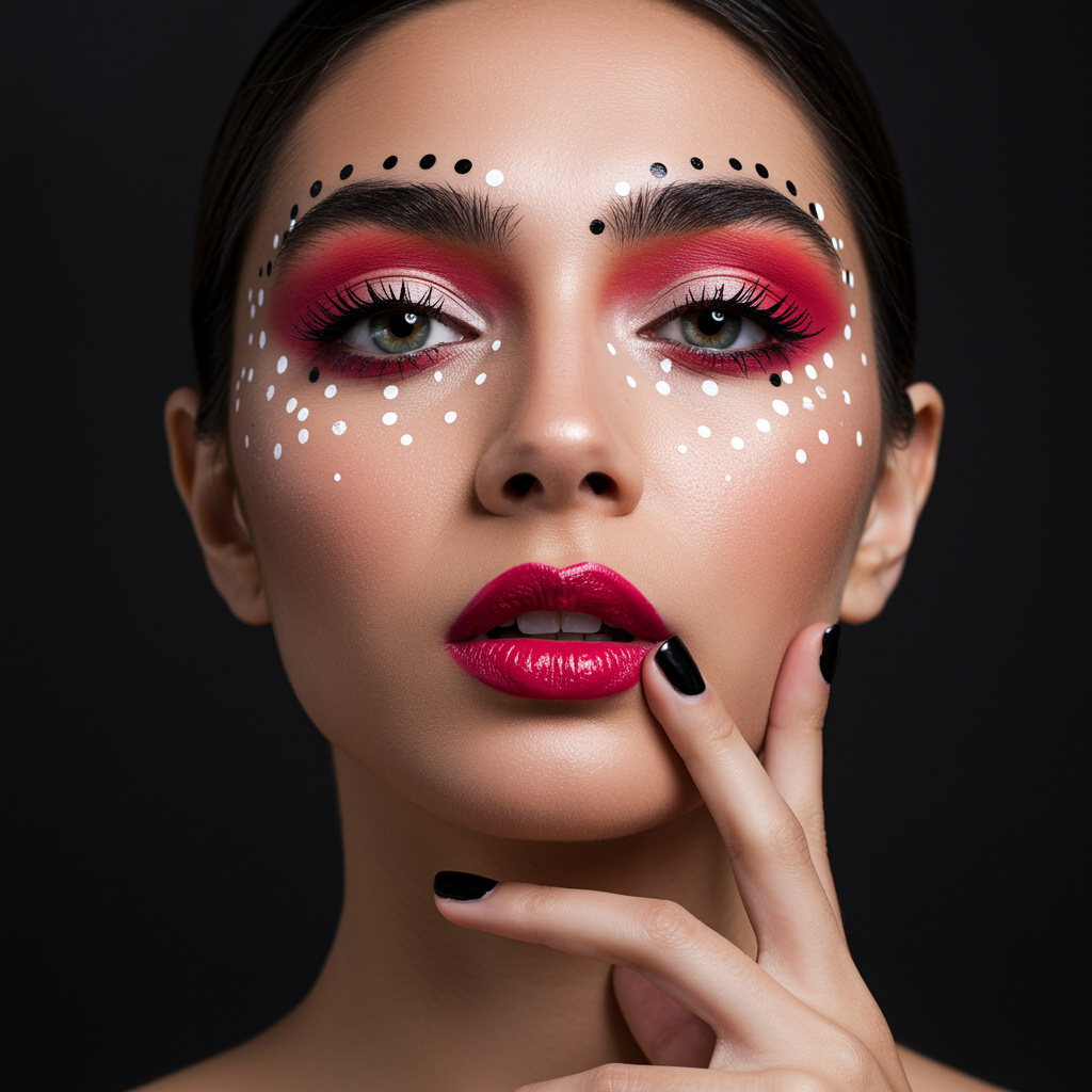 A striking female portrait embracing bold and bright makeup with vivid eyeshadow and daring lip colors, featuring imaginative designs and patterns on the face. The composition follows the rule of thirds, enhancing the allure and balance of the image. The atmosphere is lively and vibrant, capturing an expressive, artistic essence with a touch of whimsical spontaneity. The portrait feels dynamic and full of life, inviting the viewer to explore each detail and color choice.
