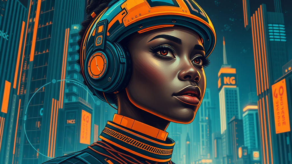 A striking female portrait embracing the essence of Afrofuturism, inspired by George Callaghan's distinctive style, intertwined with elements of engineering and construction design. The composition reflects vibrant urban life, enriched with dark cyan and orange hues. A high-definition poster art presentation, capturing intricate details and imaginative depictions of futuristic cityscapes, using a stylized approach to blend technology and culture seamlessly.