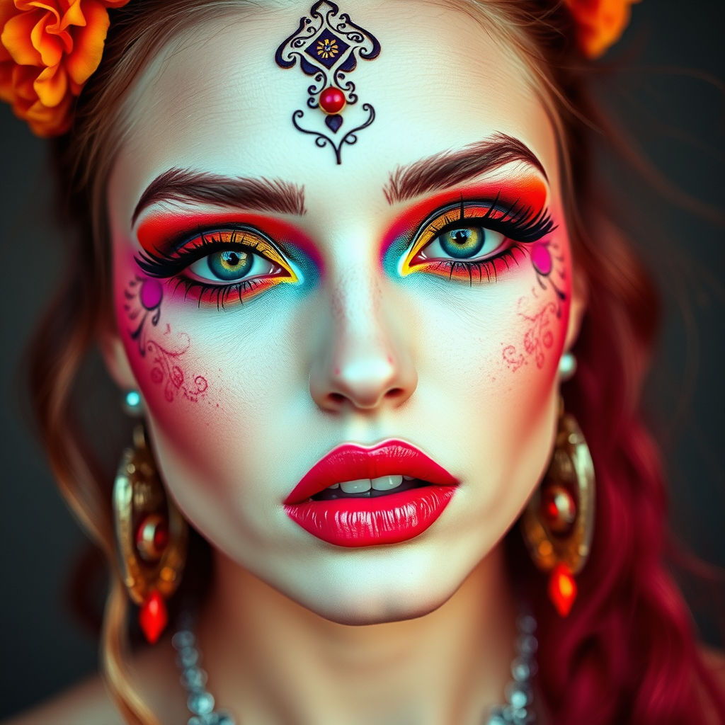 A striking female portrait showcasing bold and bright makeup with vivid eyeshadow and daring lip colors, enhanced by intricate, creative designs. The composition follows the rule of thirds with an aspect ratio of 4:5, introducing a touch of whimsy and unpredictability, emphasizing artistic flair and expression. The look is vibrant, captivating, and imaginative, conveying a sense of creativity and uniqueness.