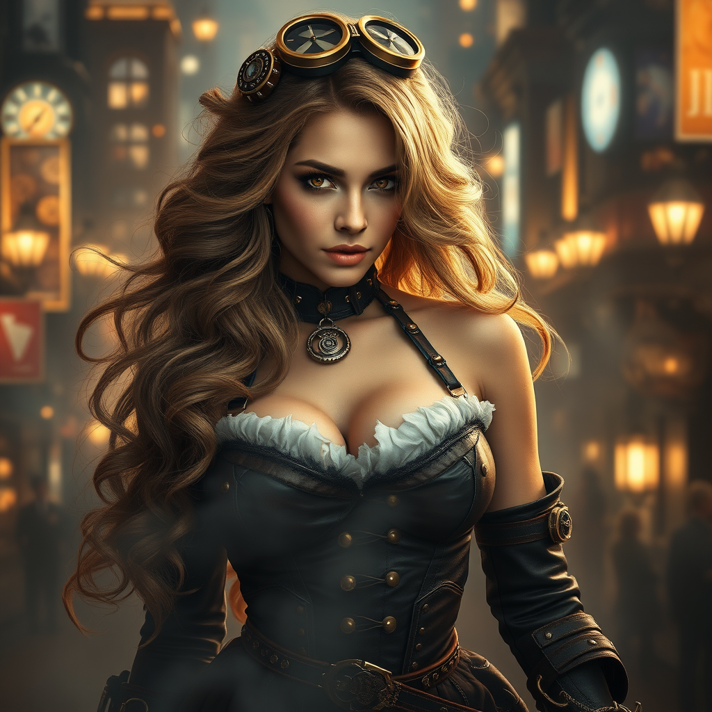 A striking female steampunk character set against the backdrop of a bustling Victorian city, her long, wavy hair cascading gracefully around her. The scene is illuminated by exquisite lighting that highlights intricate details, capturing the essence of a Julie Bell masterpiece. The composition boasts an 8k resolution, showcasing ultra-sharp focus, enveloped in a mysterious volumetric fog. Her dynamic pose exudes confidence and elegance, framed by the intricate mechanical elements of her attire and surroundings. The visual narrative avoids any distortions, maintaining anatomical accuracy and artistic finesse, free from any digital artifacts or unwanted markings, ensuring a seamless and captivating portrayal.