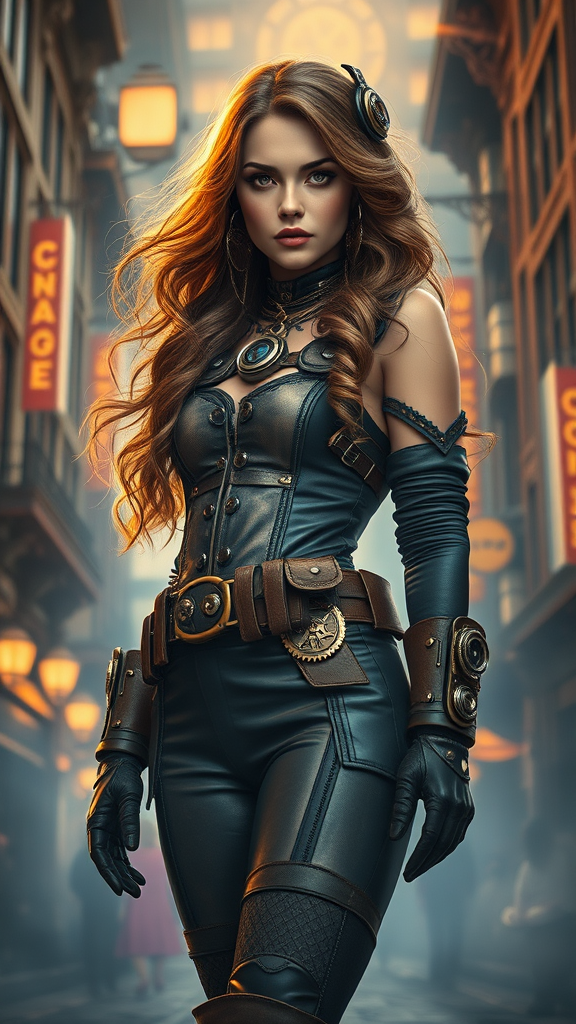 A striking female steampunk character stands confidently in a bustling Victorian city, her long wavy hair catching the beautiful, warm glow of the environment. The scene is captured in stunning detail, 8k quality, and ultra-sharp focus. She is poised dynamically amidst volumetric fog that swirls gently around her. The cityscape behind her is filled with intricate architectural designs reminiscent of Julie Bell's artistry, further enhanced by the play of light and shadow. Her attire is a masterpiece of steampunk fashion, with elaborate gears and gadgets, lending an air of innovation and elegance. The atmosphere teems with the mystery and charm of an alternative history, illuminated under a captivating light.
