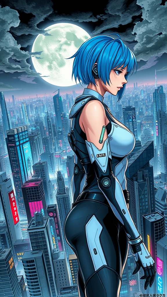 A striking figure of a powerful woman with cybernetic enhancements and vivid blue hair stands in profile against the backdrop of a sprawling, dystopian Japanese metropolis. Her futuristic attire is intricately detailed, blending high-tech elegance with sleek functionality. The city's skyline looms under a foreboding dark sky, filled with towering structures and mysterious neon lights, casting an enigmatic glow. The illustration is rendered with intricate line work reminiscent of manga, utilizing bold cell shading and the dynamic style of a graphic novel. The digital painting features a vibrant color palette, creating a vivid scene that blends the influences of Masamune Shirow and Hajime Shimomura.