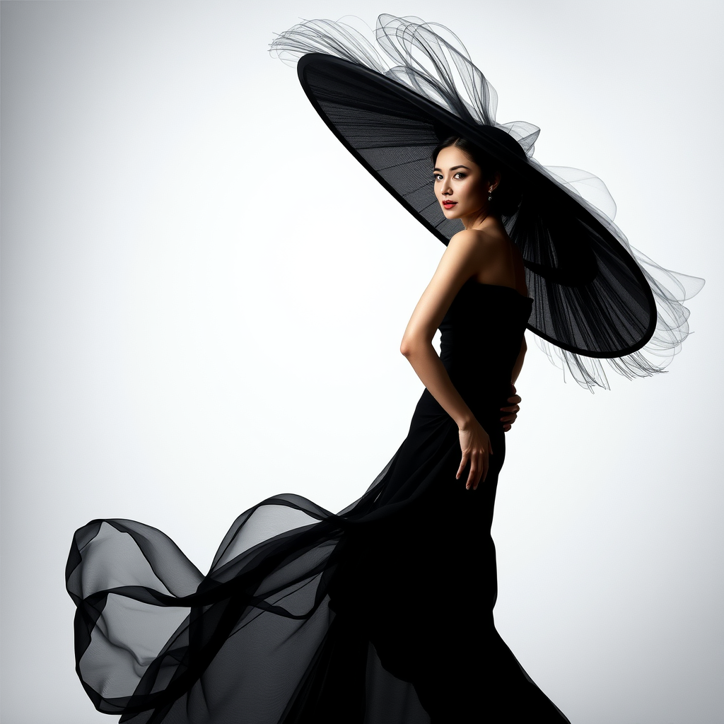 A striking figure of a woman in an elegant black gown, adorned with an oversized hat tilted to the right, the scene crafted with ingenious play of negative space; breathtakingly beautiful, intertwining light and shadow with precision, capturing crisp lines and intricate dark forms in a mesmerizing dance.