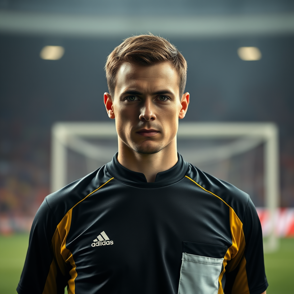 A striking football referee, exuding attractiveness, stands confidently on the field, perfectly centered and looking directly at the viewer. This portrait photography captures the realistic, meticulously detailed skin texture with 8k resolution, showcasing a highly detailed, full-length frame. The image features high-detail raw color art with diffused soft lighting and a shallow depth of field for sharp focus. The atmosphere is one of hyperrealism, enhanced by cinematic lighting reminiscent of CGI and 3D techniques. Despite the low resolution, the visual avoids common errors such as cropped frames, poor quality textures, and jpeg artifacts. It maintains artistic integrity without including distracting elements like text, errors, or abnormalities in anatomy. The scene effectively avoids issues like duplicates, deformations, or disfigured aspects, presenting a flawlessly composed portrait with natural proportions, intact limbs, and harmonious features.