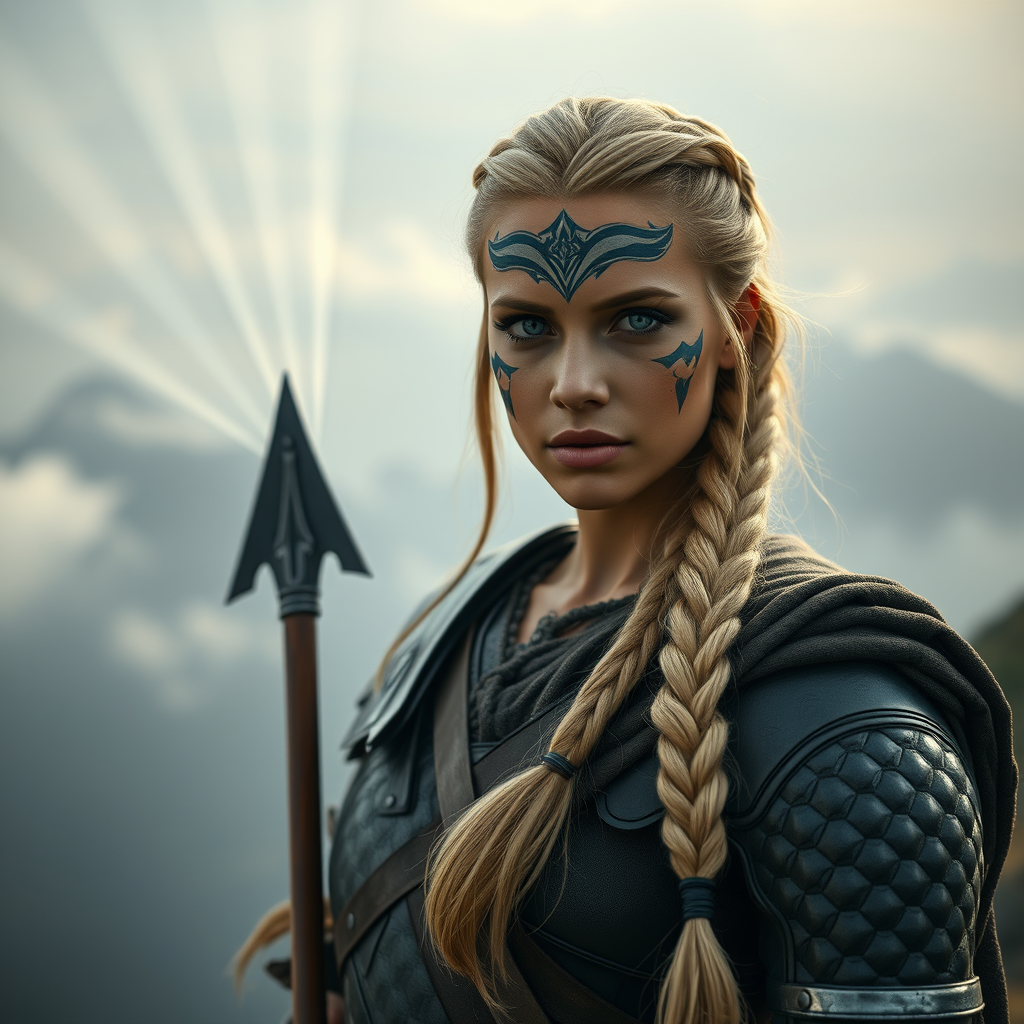 A striking full body image captures a war princess, a 25-year-old beautiful woman with blonde hair and cultural face paint, standing proudly in cloth armor. Her long, flowing, braided hair and bright grey eyes add to her allure, as she poses next to a breathtaking foggy mountain view. The scene evokes an urban fantasy feel with its elegant, intricate details reminiscent of a cinematic film still from a 1980s movie, resembling a Kodak Portra 800 film photo. Her symmetrical face, highlighted by detailed, captivating eyes and smooth skin, reflects an ultra-realistic charm. Radiant light rays punctuate the foggy mountain ambiance, creating a magical blend of realism and fantasy. Rendered with high-resolution precision, the setting is both mystical and serene, enhanced by backlight, light beams, and the dust floating in their path. The aesthetic is enchanting and dreamlike, captured with the craftsmanship of a fine art magazine, and enhanced by modern rendering techniques like octane render and unreal engine. Despite the intentional mix of exaggeration and photorealism, the scene retains its natural allure and emotional depth, offering a window into a captivating urban fantasy world.