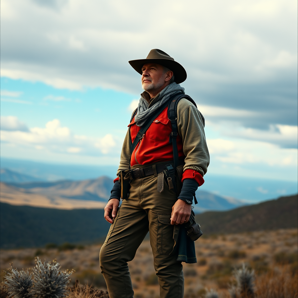 A striking full-body portrait capturing the post-'70s ego generation essence, with the subject exuding an air of regal confidence amidst a vast, majestic landscape. The rich tones of Provia film enhance the grandeur, enveloping the scene in a vibrant palette. The figure is styled in rangercore attire, combining rugged practicality with a touch of aristocratic elegance, embodying a fusion of nature and nobility. The scene is masterfully crafted using Unreal Engine 5, with intricate attention to detail, ensuring both the subject and the expansive background sing in harmony, achieving an aspect ratio of 85:128. The overall composition evokes a timeless quality that emphasizes both individual spirit and sublime beauty.