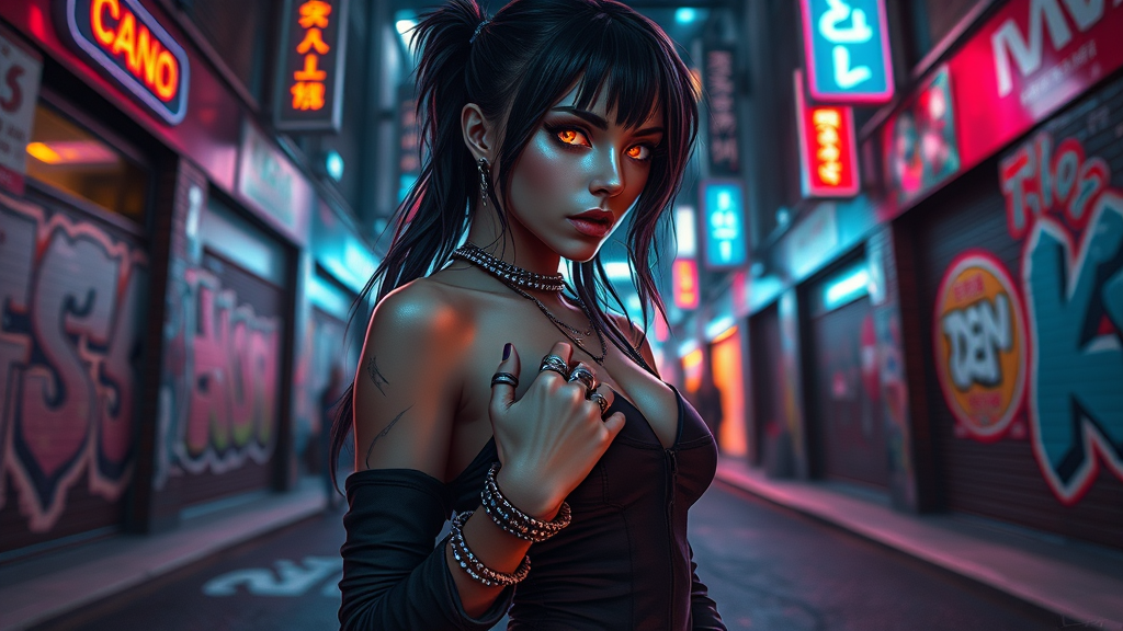 A striking full-body portrait of a cyberpunk woman standing confidently on a vibrant, neon-lit city street at night. The city lights cast colorful reflections on her detailed, symmetrical face as she stands on the pavement, her expression a mix of defiance and mystery. Her long hair flows around her, with some sections creatively styled short for an edgy look. This punk girl, with an alternative vibe, is adorned with many rings and reflective eyes enhanced by dramatic makeup. Intricate ear piercings catch the ambient glow of the detailed rim lighting. Her outfit, featuring long sleeves and bracelets, complements the urban background of a brick wall adorned with striking graffiti. Rendered as a majestic and professional impressionism oil painting, the artwork echoes the styles of Waterhouse and John Constable, with influences from Atey Ghailan, Studio Ghibli, Jeremy Mann, and Antonio Moro. This piece is trending on ArtStation and CGSociety, known for its intricate high detail and dramatic chiaroscuro lighting. Inspired by Makoto Shinkai's Kyoto, the art skillfully balances realism with fantastical elements, making it a captivating blend of various artistic disciplines.
