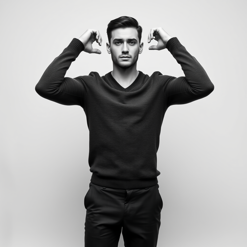 A striking full-body portrait of a male model exudes dynamic confidence as he stands with poise. His hands are comfortably clasped behind his head, elbows extending outward in a display of relaxed strength. He is dressed in a sleek, fitted charcoal v-neck sweater paired with tailored dark gray trousers that highlight his slender frame. His expression is composed, with a subtle, contemplative crease in his brow that adds depth to his penetrating gaze. The lighting is gentle and focused, enhancing the features of his face and the intricate weave of his sweater. The scene is set against a minimalist backdrop, ensuring all attention remains on him. Shot in a classic monochrome filter, the image captures a timeless essence, emphasizing sharp clarity and the absence of color, rendering the model in compelling detail.