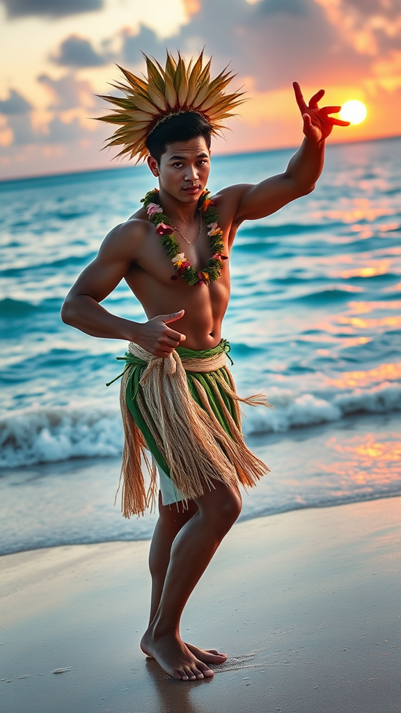 A striking full-body portrayal of a captivating traditional Hawaiian male dancer standing gracefully on a picturesque tropical beach. This youthful figure boasts a muscular physique, complemented by a flawlessly handsome face and mesmerizing eyes. The scene is depicted as an ethereal and dreamy photo-realistic oil painting, reminiscent of the styles of Studio Ghibli and Robert Wyland. The piece displays dramatic cinematic lighting, as if viewed through a 50mm lens, enhancing its hyper-realistic and intricately detailed presentation. The background exudes a serene yet vibrant atmosphere, with gentle waves kissing the shore, framed by the warm glow of a setting sun. Subtle enhancements capture the dancer's dynamic energy and connection to the earth and sea.