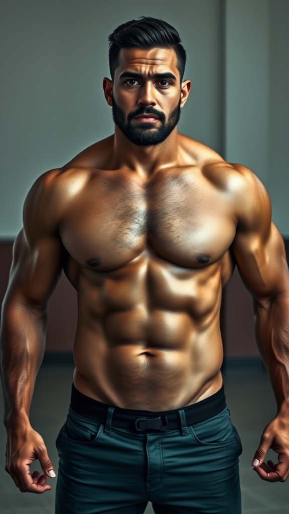 A striking full-length portrait captures an exceptionally handsome and athletic Cuban man, standing with confidence in a wide field of view. His tall, powerful frame is centered, revealing his entire body. With award-winning cinematography and photography, his asymmetrical eyes and strong, masculine features are highlighted. A well-groomed beard stubble complements his chiseled jawline, while his broad shoulders and defined muscles, including prominent abs, showcase his athletic build. His hairy chest adds to the rugged allure as he poses effortlessly, showing off his toned legs in a photo-realistic style. The scene captures his magnetic presence and charisma, enveloping the viewer in his captivating aura.